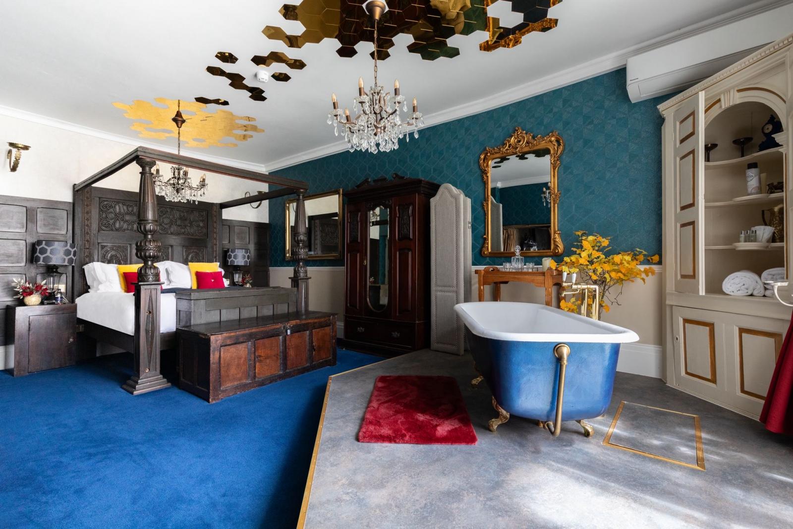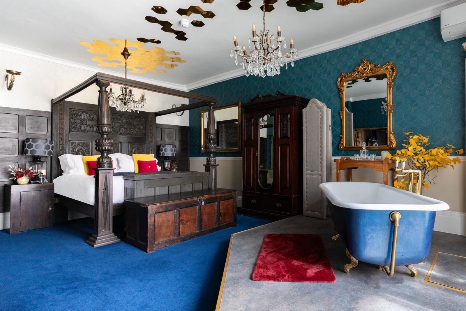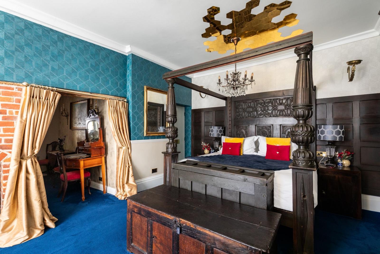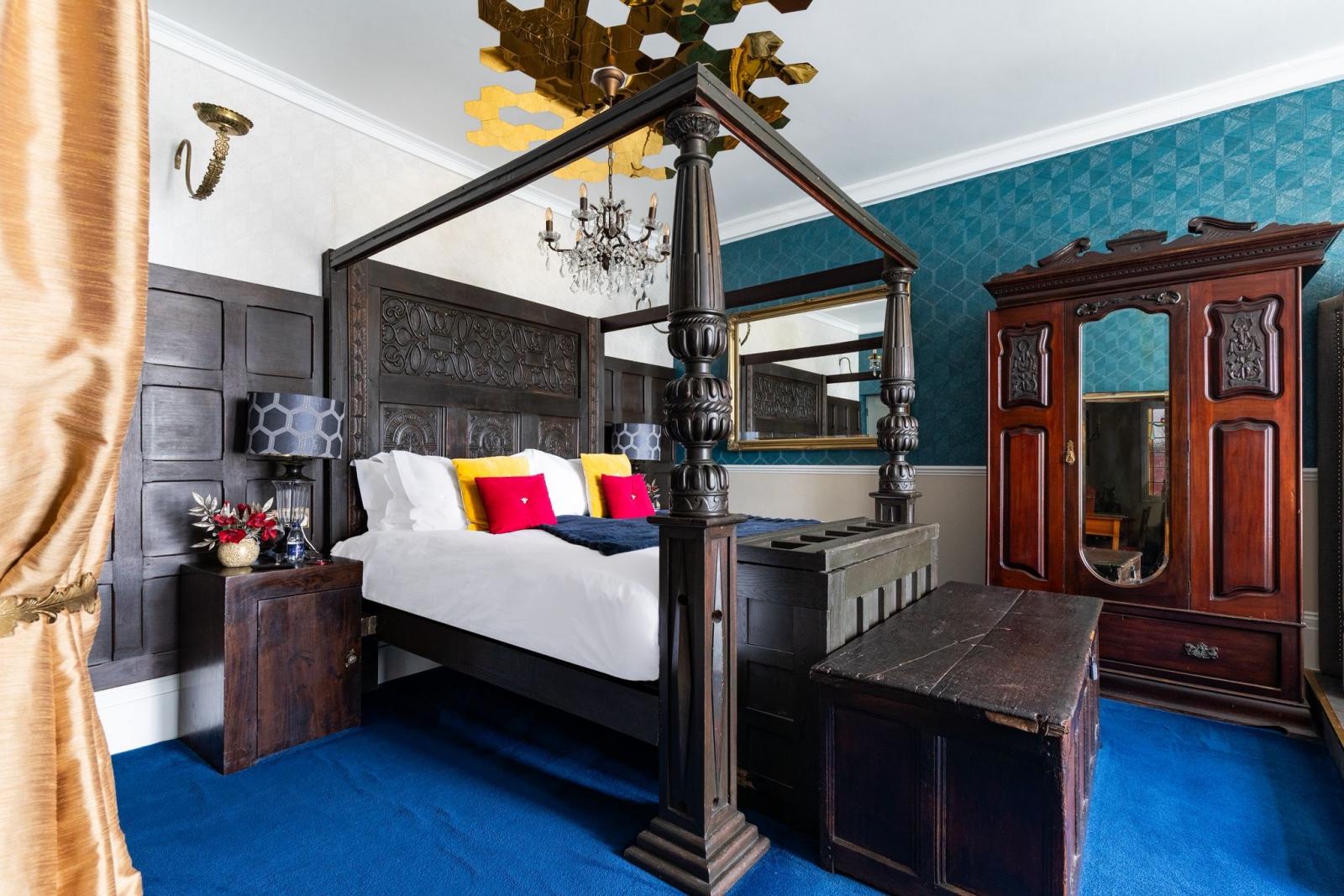 Furnishings are a mix of old and new, including an antique, 200 year old carved oak headboard, and modern day luxury, textured teal wallpaper, with tasteful and luxury equipment