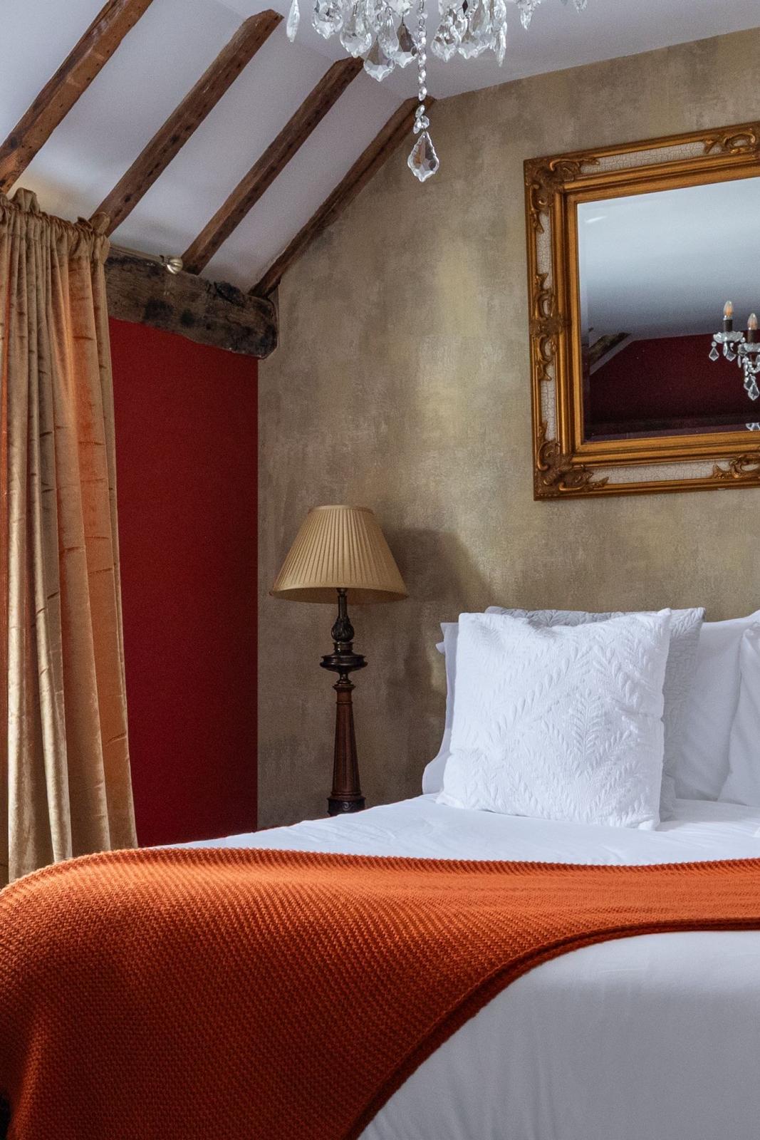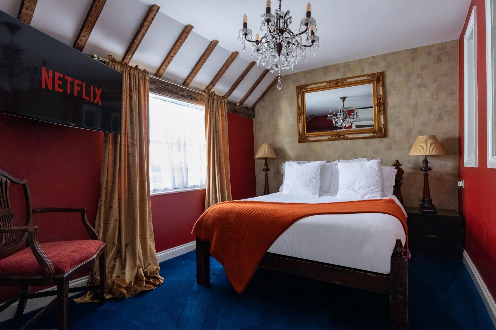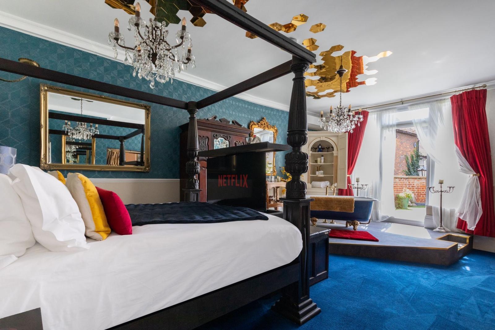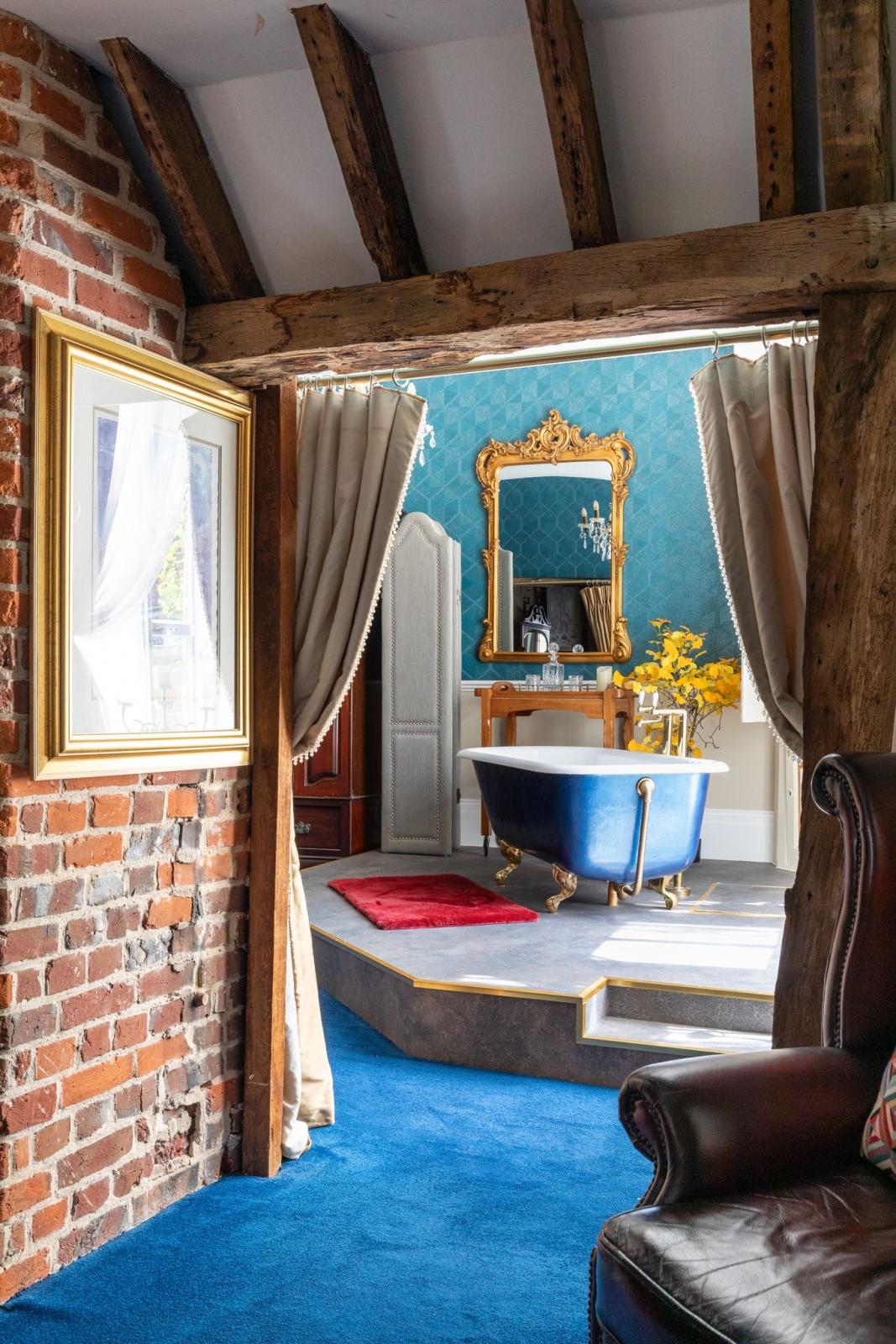 Furnishings are a mix of old and new, including an antique, 200 year old carved oak headboard, and modern day luxury, textured teal wallpaper, with tasteful and luxury equipment