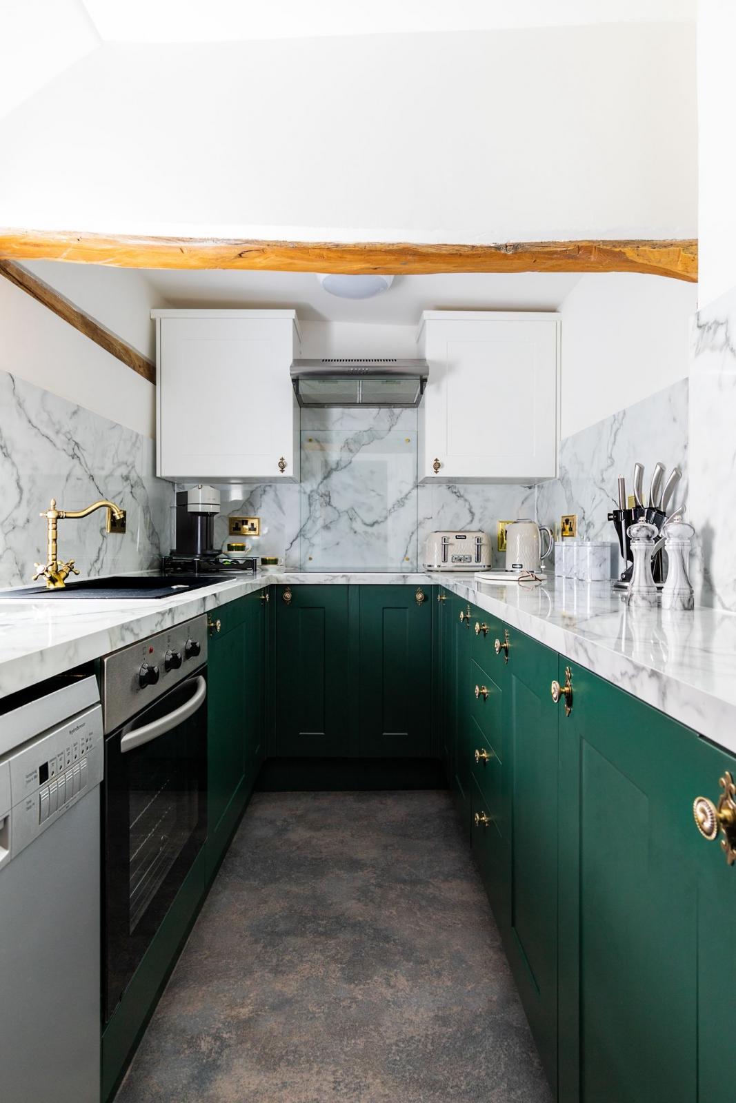 Small kitchen with full utensils, undercounter fridge freezer, oven, work top cooker hob, and dishwasher